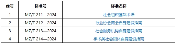 《社会组织基础术语》、《行业协会商会自身建设指南》、《社会服务机构自身建设指南》和《学术类社会团体自身建设指南》4项推荐性行业标准已经民政部批准,现予以发布,自2024年5月1日起实施。