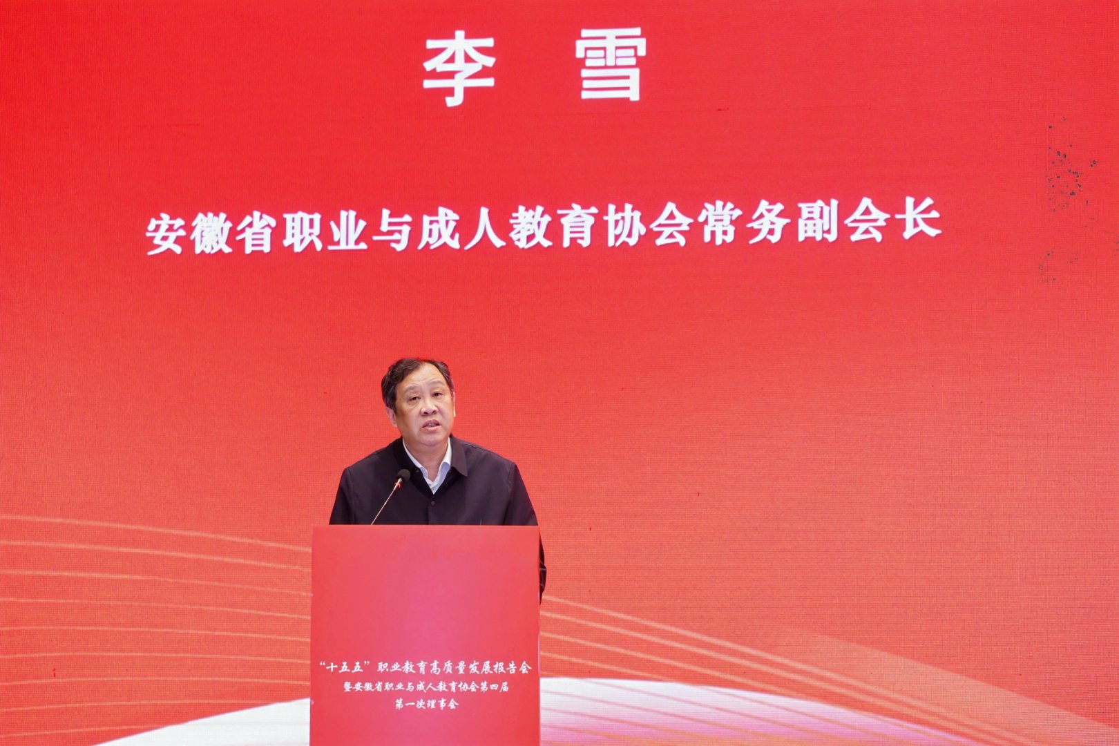 教育部职业教育发展中心主任林宇,中国职业技术教育学会副会长、教育部学校规划建设发展中心原主任李平,中国职业技术教育学会副会长、中央民族大学党委原常委、副校长宋敏,国家职业教育指导咨询委员会委员、华东师范大学职业教育与成人教育研究所所长徐国庆,高等教育出版社副总编辑贾瑞武,安徽省委教育工委副书记蒋家平,安徽省民政厅党组成员、副厅长周文芳,安徽省人力资源和社会保障厅党组成员、副厅长程连政,安徽省工信厅二级巡视员王国武,淮北市人大常委会副主任、市中华职教社主任金文,北京竞业达数码科技股份有限公司总裁张爱军,安徽新华传媒股份有限公司党委委员、副总经理纵艳丽,中国职业技术教育学会、高等教育出版社以及省教育厅、人社厅、工信厅、民政厅相关部门的负责同志出席会议。会议分两段召开,第一段是“十五五”职业教育高质量发展报告会,由安徽省职业与成人教育协会和安徽省中华职教社联合举办,由安徽省职业与成人教育协会会长、省教育厅原一级巡视员解平主持;第二段是协会第四届第一次理事会,由安徽省职业与成人教育协会常务副会长、合肥科技职业学院院长李雪主持。
