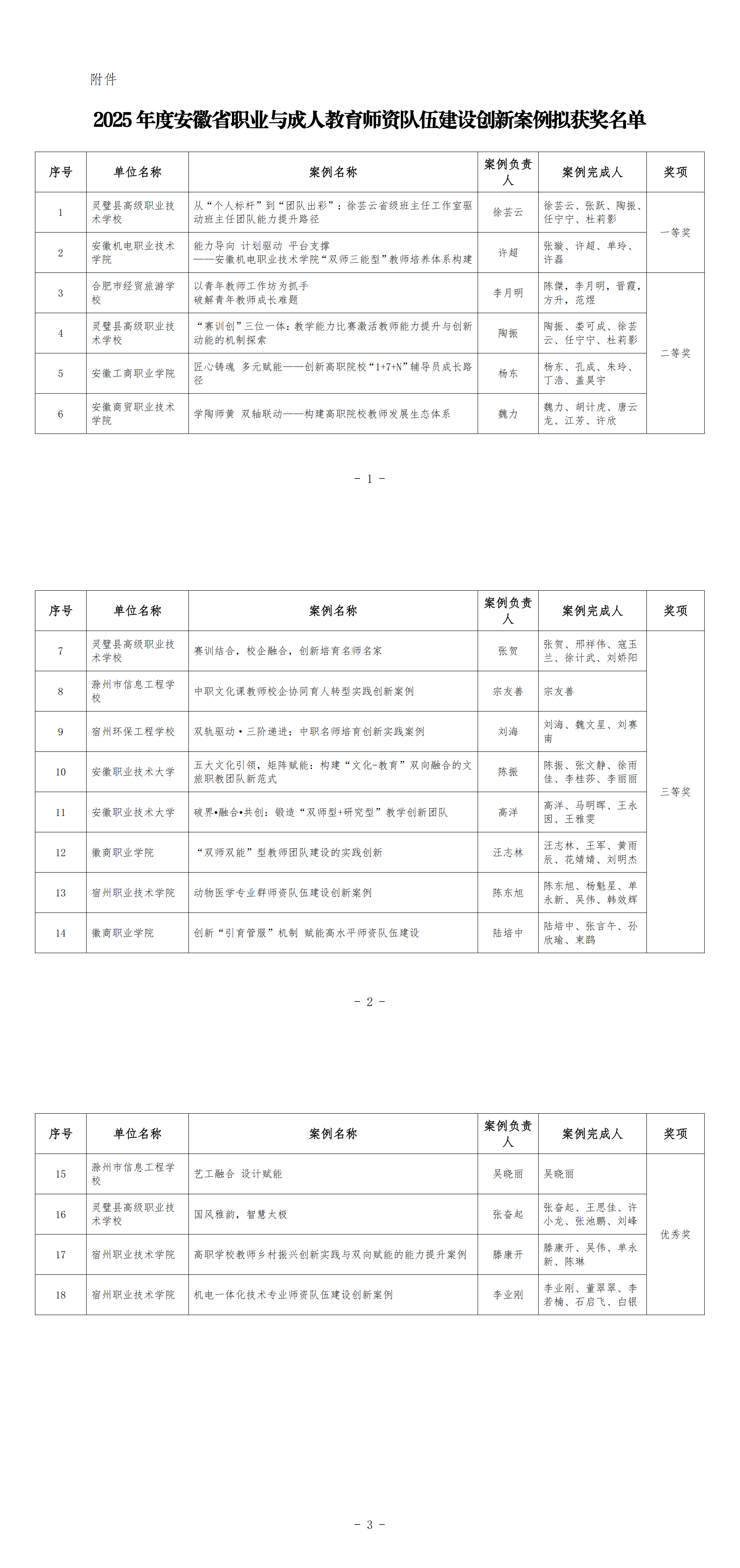 附件:2025年度安徽省职业与成人教育师资队伍建设创新案例拟获奖名单