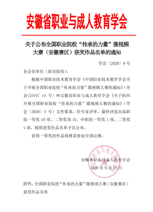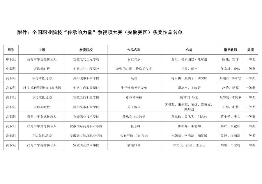 关于公布全国职业院校传承的力量微视频大赛(安徽赛区)获奖作品名单的通知.pdf