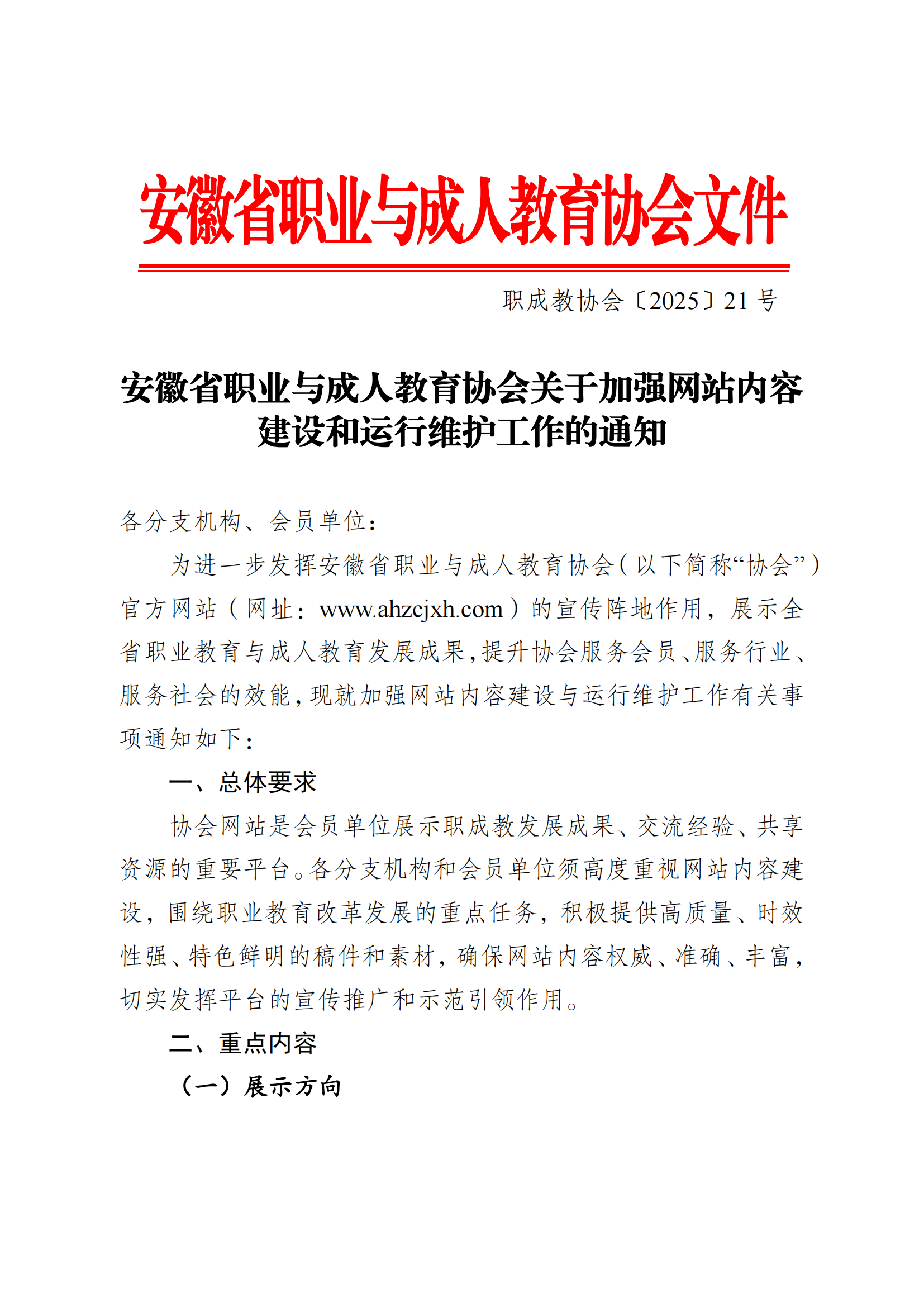 【 附件下载:【2025】21号 安徽省职业与成人教育协会关于加强网站内容建设和运行维护工作的通知.pdf 】