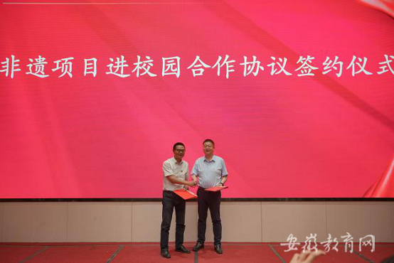 成立大会还组织了部分高职院校与地市文化馆的校地合作签约,涡阳县文化馆、潜山市文化馆、当涂县文化馆、无为县文化馆、萧县文化馆、舒城县文化馆、望江县文化馆、界首市文化馆、宿州市泗州戏剧团、凤台县文化馆等多家省级非遗保护单位代表,与专委会部分会员单位、院校代表共同签署“后备艺术人才培养基地共建协议”;校校联盟签约,安徽艺术学院、安徽艺术职业学院、安徽黄梅戏艺术职业学院、安徽广播影视职业技术学院、合肥幼儿师范高等专科学校、灵璧县高级职业技术学校、蒙城县职业教育中心、天长市工业学校、宣城市工业学校、广德科技职业技术学校、皖北经济技术学校、霍山职业学校、安徽省行知中学等多所院校代表签署《职业院校艺术类专业人才培养共同体备忘录》;非遗进校园合作签约,安徽科教公益基金会与专委会代表签署合作协议。