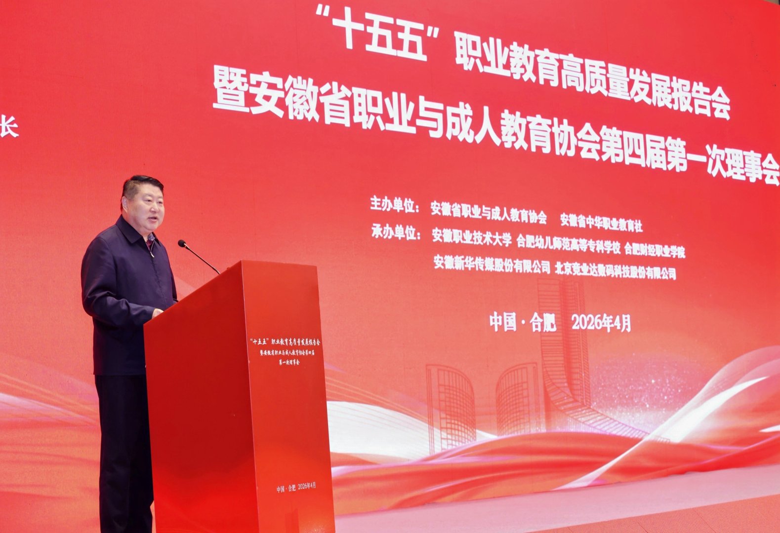 教育部职业教育发展中心主任林宇,中国职业技术教育学会副会长、教育部学校规划建设发展中心原主任李平,中国职业技术教育学会副会长、中央民族大学党委原常委、副校长宋敏,国家职业教育指导咨询委员会委员、华东师范大学职业教育与成人教育研究所所长徐国庆,高等教育出版社副总编辑贾瑞武,安徽省委教育工委副书记蒋家平,安徽省民政厅党组成员、副厅长周文芳,安徽省人力资源和社会保障厅党组成员、副厅长程连政,安徽省工信厅二级巡视员王国武,淮北市人大常委会副主任、市中华职教社主任金文,北京竞业达数码科技股份有限公司总裁张爱军,安徽新华传媒股份有限公司党委委员、副总经理纵艳丽,中国职业技术教育学会、高等教育出版社以及省教育厅、人社厅、工信厅、民政厅相关部门的负责同志出席会议。会议分两段召开,第一段是“十五五”职业教育高质量发展报告会,由安徽省职业与成人教育协会和安徽省中华职教社联合举办,由安徽省职业与成人教育协会会长、省教育厅原一级巡视员解平主持;第二段是协会第四届第一次理事会,由安徽省职业与成人教育协会常务副会长、合肥科技职业学院院长李雪主持。