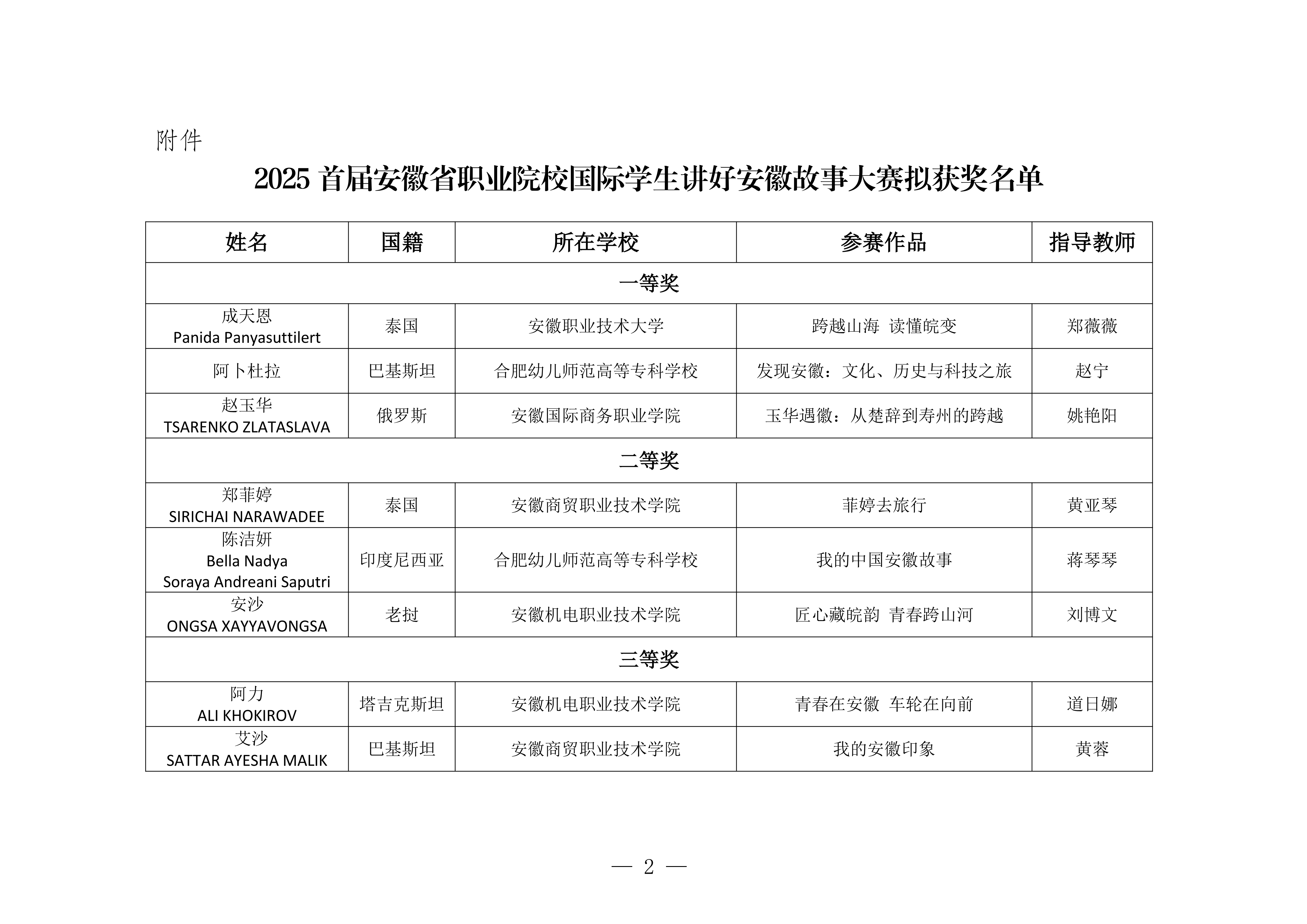 附件:2025首届安徽省职业院校国际学生讲好安徽故事大赛拟获奖名单